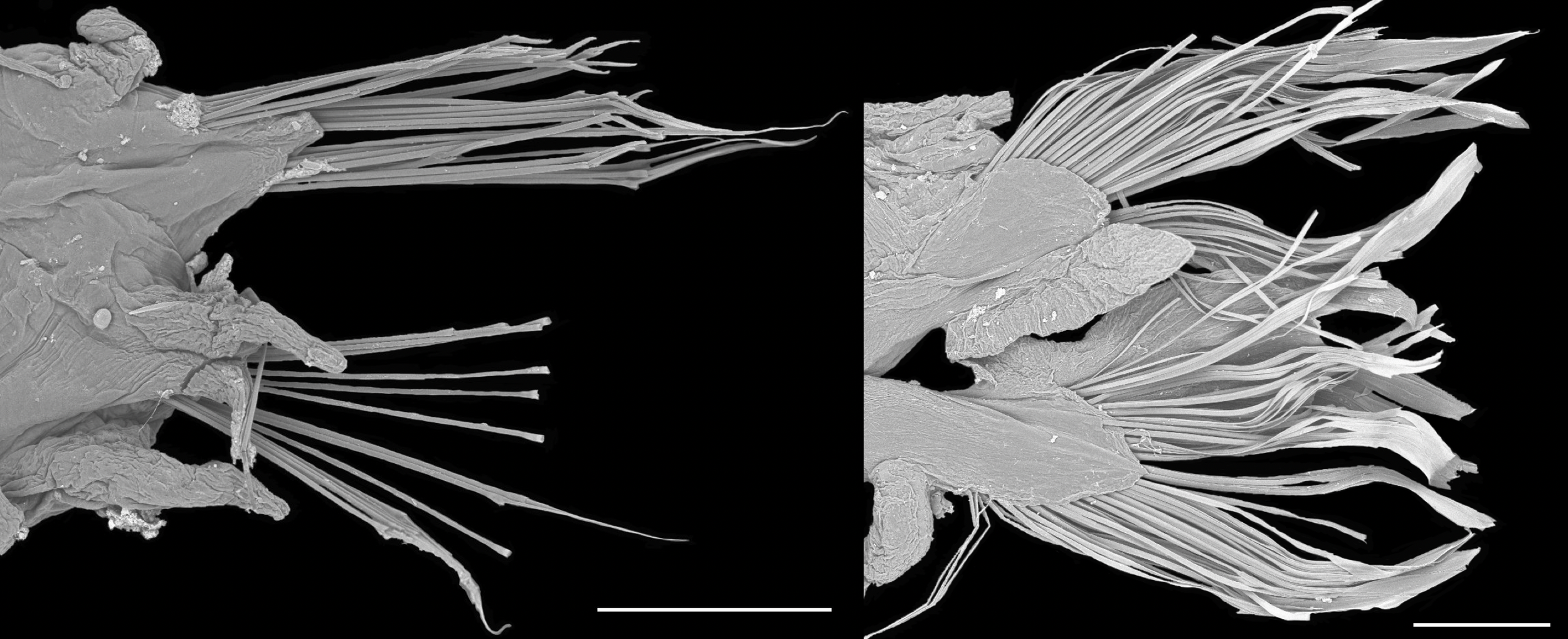 Scanning electron micrographs of parapodia (think limbs) of Alitta succinea. The left image is taken from a non-reproductive worm that has bristles for crawling. The right side is after metamorphosis when the worm has bristles adapted for swimming. SB is 200 microns.